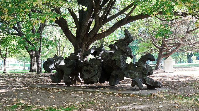Elles sont là depuis tellement longtemps qu’on ne les voit presque plus. Il faut dire qu’elles ne sont pas vraiment mises en valeur : aucun panneau n’explique la présence de ces sculptures sur le mont Royal, entre la Maison Smith et le lac aux Castors. Aucune plaque individuelle n’identifie l’œuvre ou l’artiste, ou n’indique la date de création. En fait, toutes ces sculptures ont été créées en 1964, à l’occasion du premier symposium international de sculptures en Amérique du Nord. Entre le 23 juin et le 15 août, 12 sculpteurs provenant de 10 pays ont travaillé sous les yeux du public pour créer des œuvres uniques, très représentatives de leur époque. Certaines n’ont pas pris une ride : l’œuvre sans nom du sculpteur indien Krishna Reddy demeure délicieusement érotique ; Les sœurs cardinales, de l’artiste grec Yérassimos Sklavos, sont toujours aussi élégantes et émouvantes ; La force, du Québécois Armand Vaillancourt, est encore insaisissable. Cette œuvre abstraite ressort du lot parce qu’il s’agit d’une structure de fonte peinte en noire, alors que les autres sculptures font essentiellement appel à la pierre calcaire ou au marbre blanc.