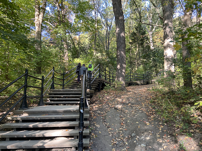 avenue des Pins, nous grimpons par les escaliers rue Peel et le Grand Escalier du Mont Royal vers le chalet du Mont Royal